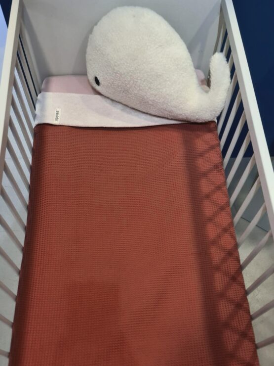 Handgemaakt in ons eigen atelier een mooi ledikant deken in een clay/roest kleur + een matrashoes in een mooie licht roze kleur. Geeft de finishing touch aan je babykamer. Alles gemaakt van 100% katoen!