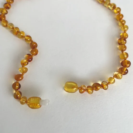 Wanneer (Amber)barnsteen in contact komt met de huid, komt er barnsteenzuur vrij. Barnsteenzuur is een krachtige antioxidant die de lichaamscellen beschermt. De sterke antioxidant heeft ontstekingsremmende eigenschappen waarvan gezegd wordt dat ze de pijn bij het doorkomen van de tandjes van de baby verlichten.