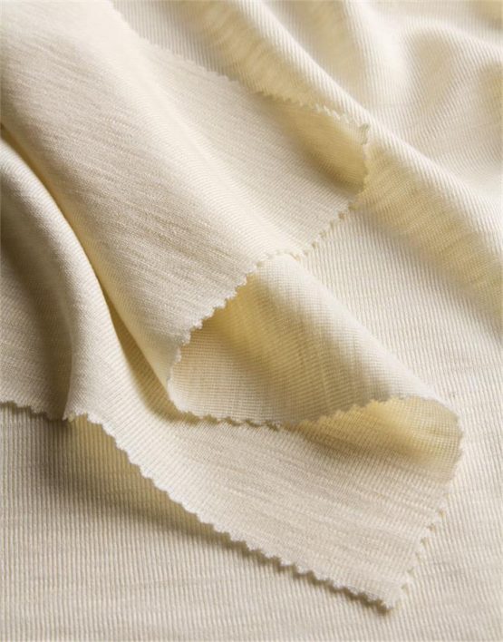 Biologische gecertificeerde scheerwol zijde jersey van gecontroleerde biologische veehouderij, zacht en rekbaar, in natuurlijk wit. Ideaal voor rompertjes, leggings, en mutsjes